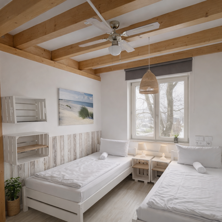 Unser modernes Vierbettzimmer ist ideal für Familien, Freunde oder kleine Gruppen. Die durchdachte Kombination aus mehreren hochwertigen Schlafplätzen bietet Komfort und Funktionalität zugleich. Klare Linien, ruhige Farben und ein gepflegtes Gemeinschaftsbad in unmittelbarer Nähe sorgen für einen entspannten Aufenthalt in ruhiger Atmosphäre.