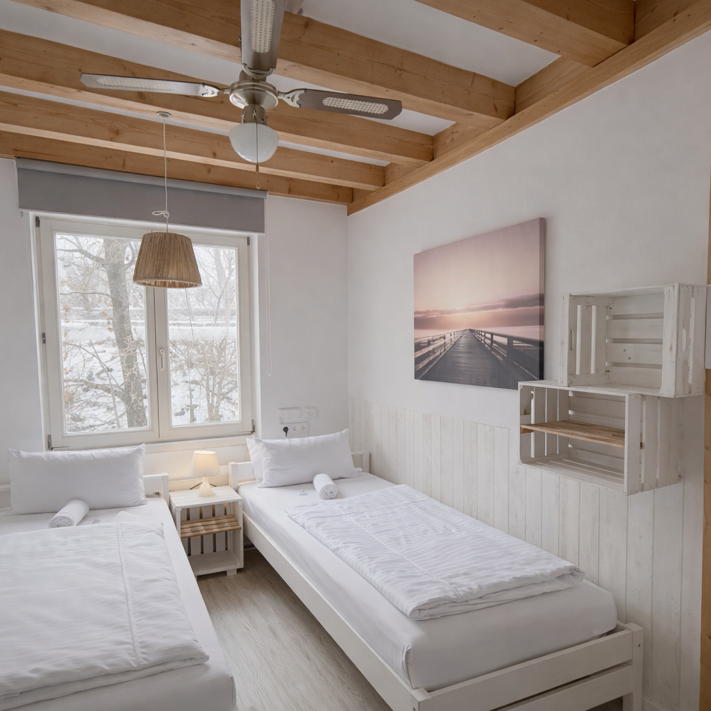 Unsere Zimmer stehen dir exklusiv zur privaten Nutzung zur Verfügung und bieten flexible Optionen für unterschiedliche Bedürfnisse. Ob Einzelzimmer, Doppelzimmer oder Vierbettzimmer – bei uns übernachtest du ruhig, komfortabel und stilvoll, ganz nach deinen Vorstellungen.